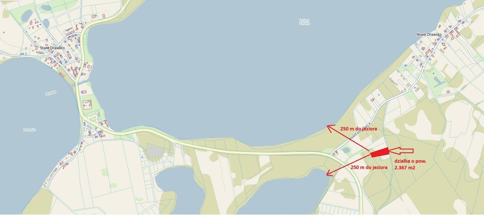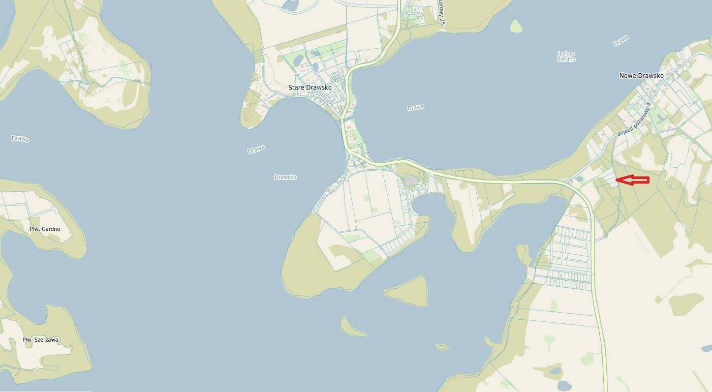 Nieruchomość znajduje się w odległości zaledwie ok. 250 m od dwóch dużych jezior Żerdno i Drawa, co czyni ją idealnym miejscem zarówno do zamieszkania na stałe, jak i pod zabudowę rekreacyjną.